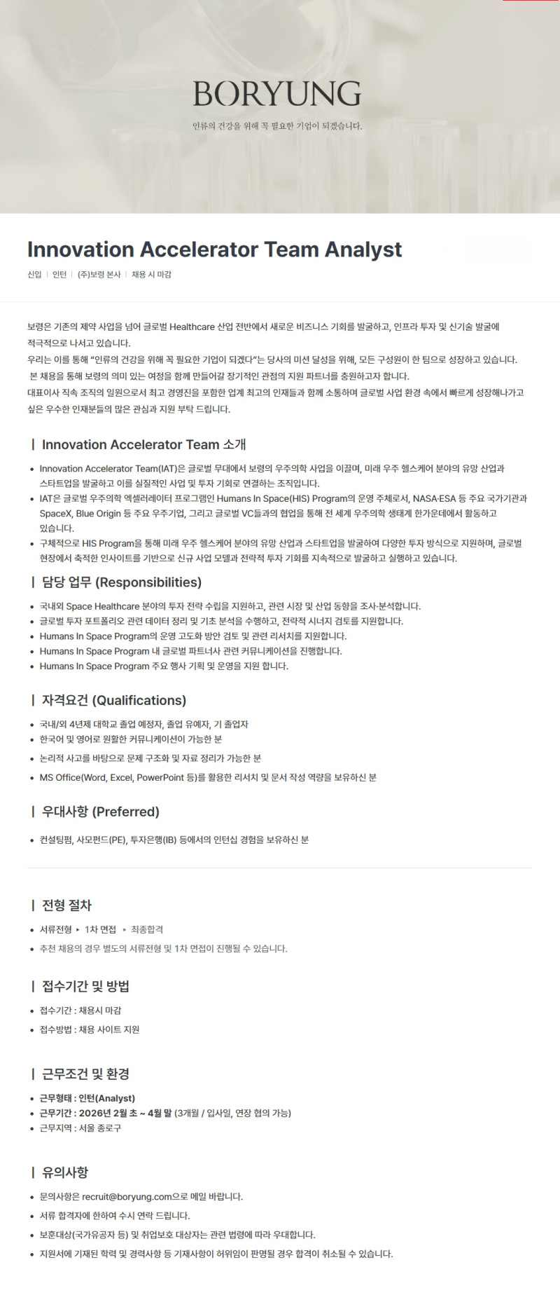 (주)보령 Innovation Accelerator Team Analyst 인턴 채용 (~채용시 마감)