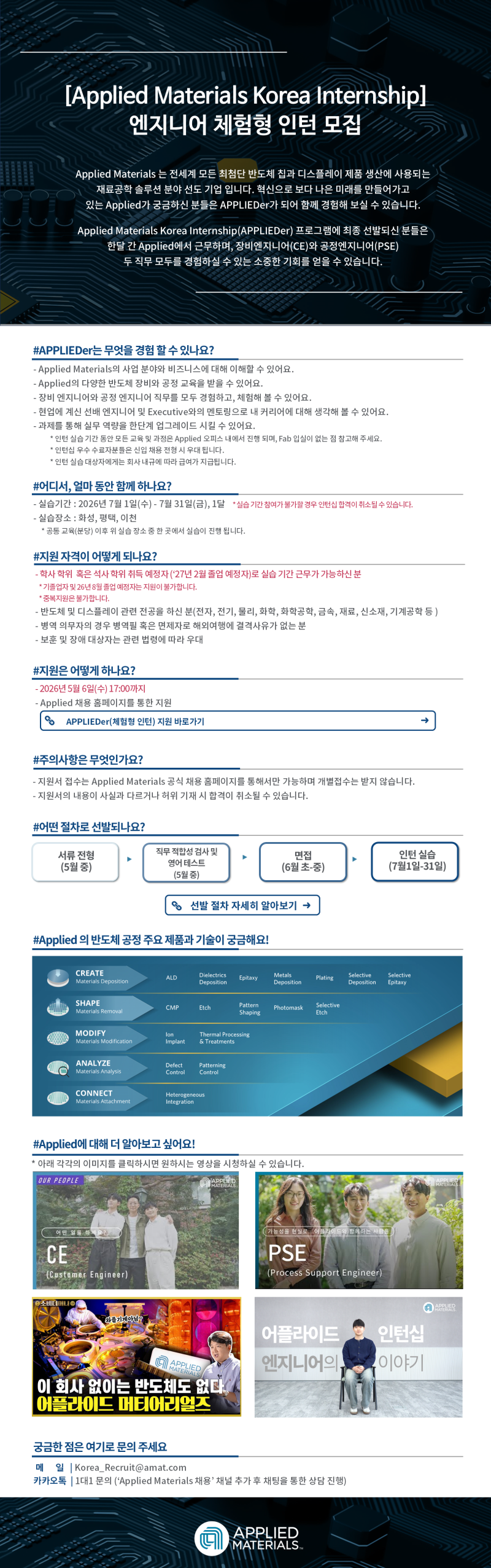 어플라이드 머티어리얼즈 코리아에서 2026년 엔지니어 체험형 인턴십 모집을 진행하고 있습니다.