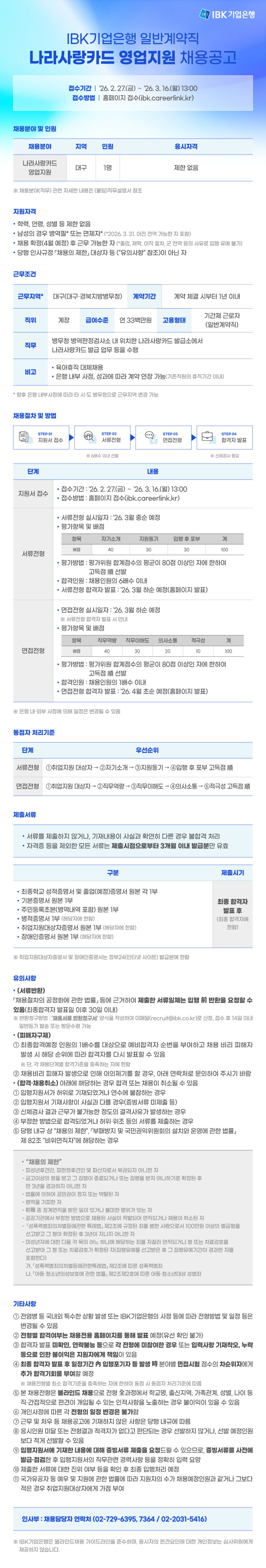 [IBK기업은행] 일반계약직 나라사랑카드 영업지원 채용 (~3/16, 13:00)