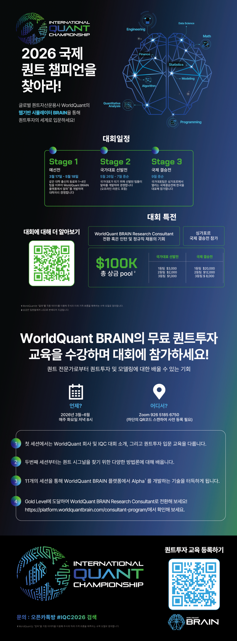 글로벌 퀀트 자산운용사 WorldQuant에서 2026 국제 퀀트 모의투자 대회(International Quant Championship)를 개최합니다!