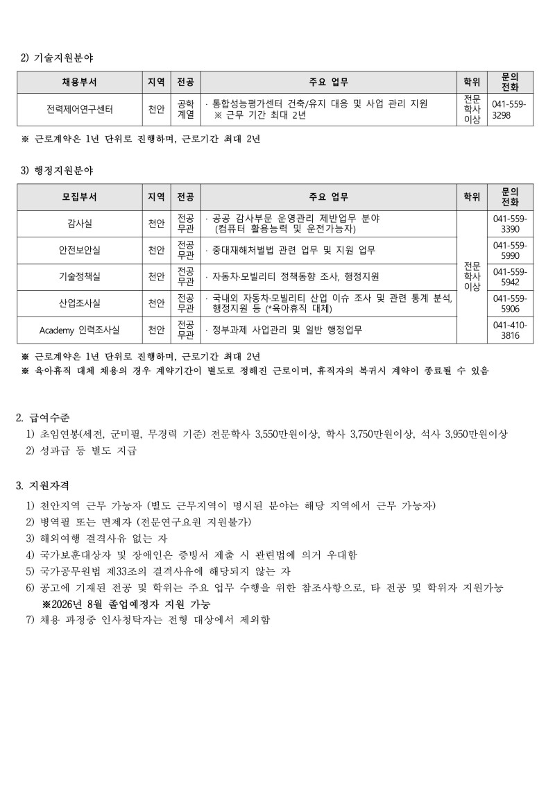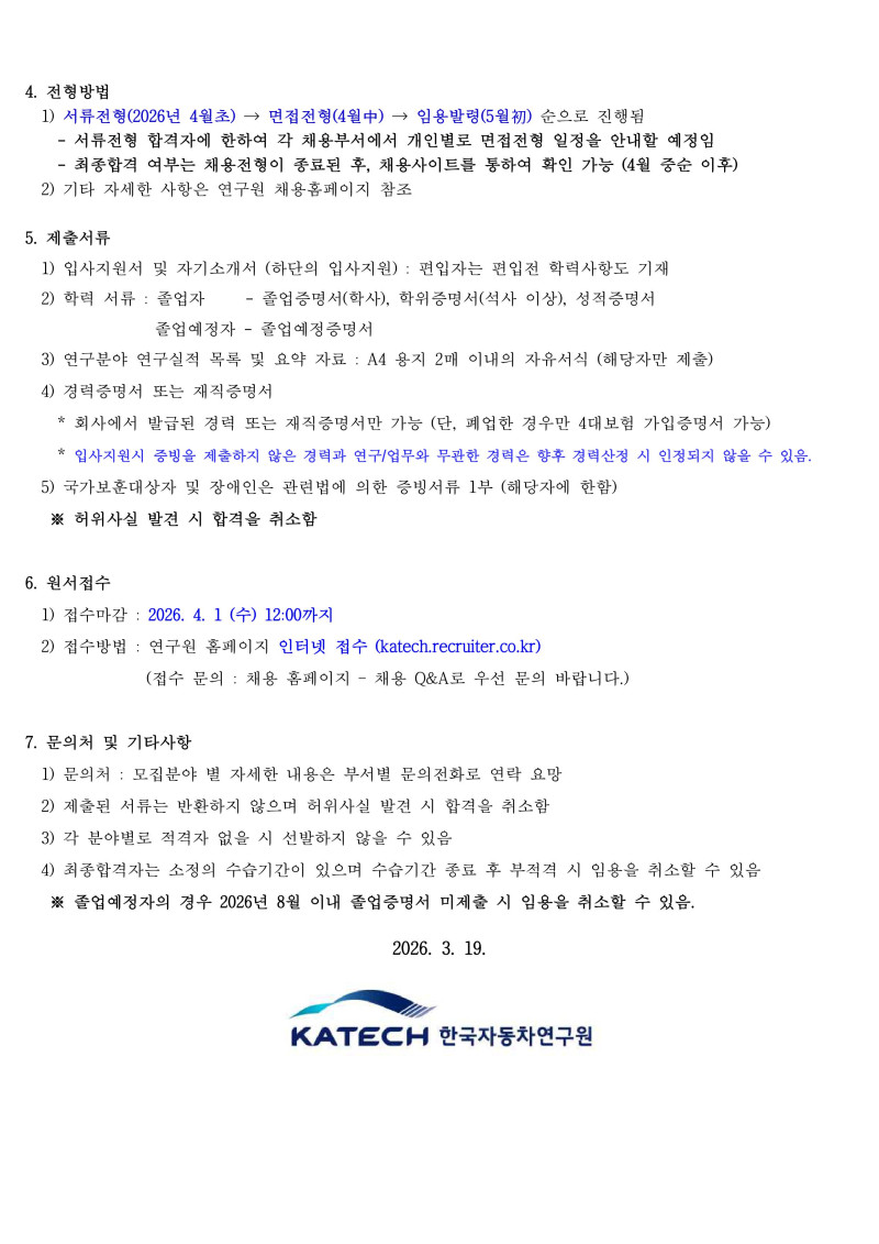 [한국자동차연구원]2026년 5월 별정직(계약직)모집공고 (~4/1 12:00)