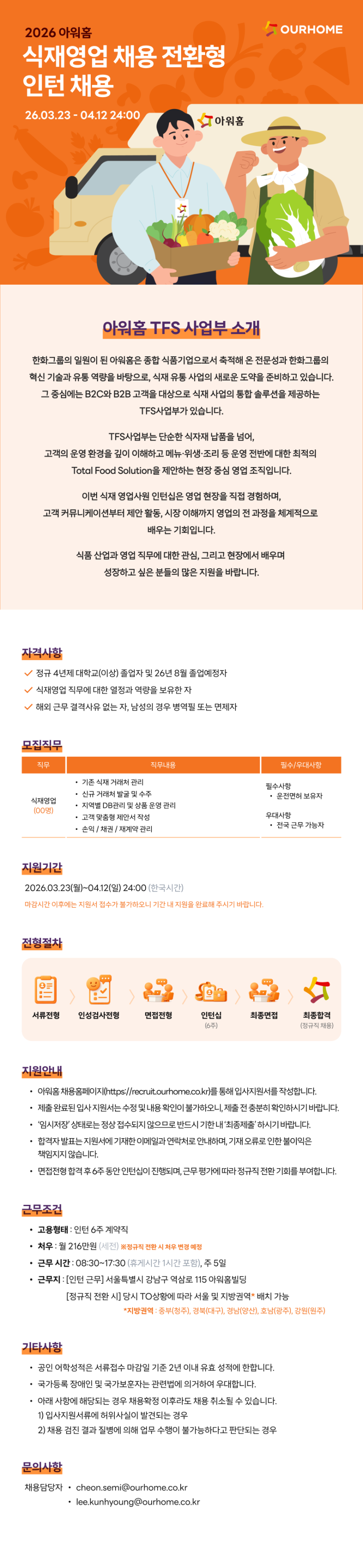[아워홈] 2026 아워홈 식재영업 채용 전환형 인턴 채용 (~4/12)