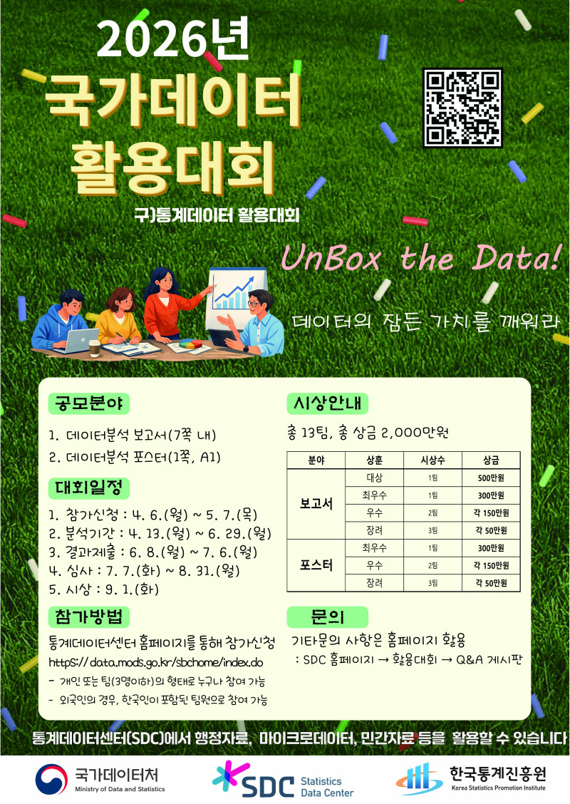 국가데이터처에서는 일반국민의 창의적 데이터 활용 역량을 제고하고, 데이터 기반 의사결정 문화를 확산하고자 「2026년 국가데이터 활용대회」를 개최합니다.