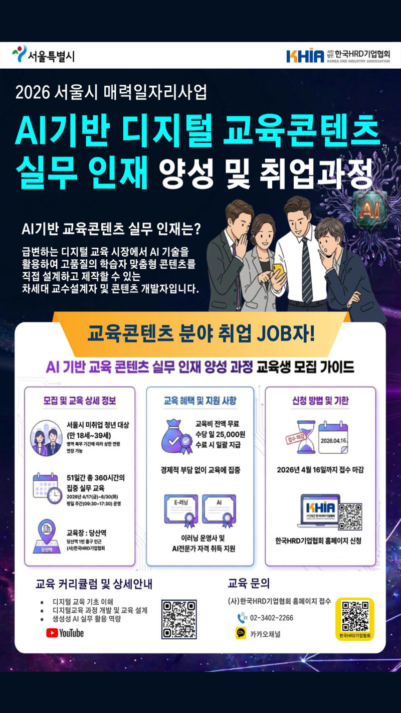 [2026 서울시 매력일자리] 교육비 전액 무료 + 인턴십 연계! AI기반 교육콘텐츠 실무인재 양성과정 &AI기반 기업교육 안…
