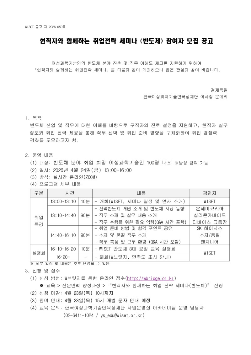 1. 2026년 WISET 현직자와 함께하는 취업 전략 세미나(반도체) 홍보 협조 요청 공문